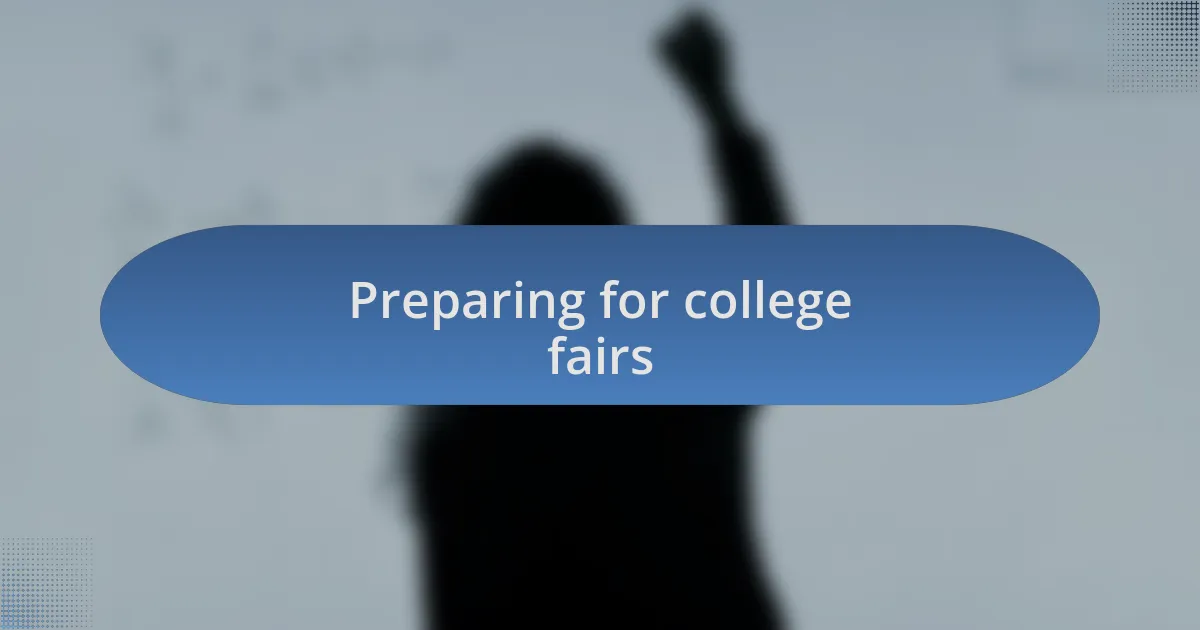 Preparing for college fairs requires a little strategy to maximize your experience. Before attending, I found it incredibly helpful to research the schools that will be present. By reviewing their websites and programs, I could tailor my questions and really engage during conversations. Have you ever walked into an event feeling completely unprepared? Trust me, knowing even a little about the institutions can help you feel more confident and make the most out of your time there.